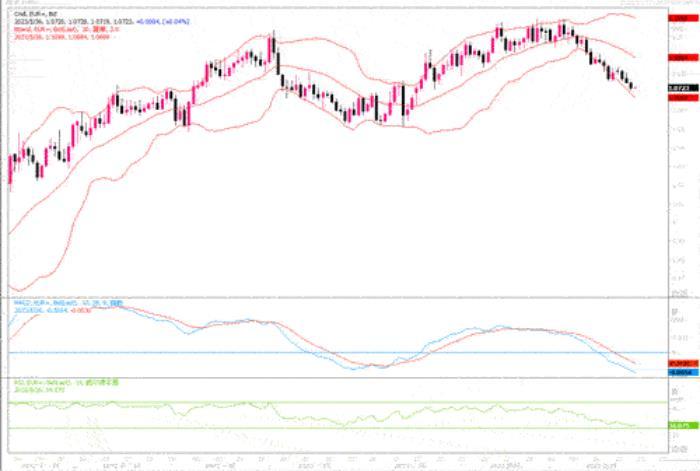 周四(5月25日)欧元兑美元继续下跌0.31%,至1.0715美元。美元兑一篮子主要货币周四连续第四个交易日走强,触及两个月高点,因美国数据显示,即使在美联储积极的加息周期内,经济仍有弹性。当日公布的美国上周初请失业金人数增加4,000人,至229,000人,低于路透估计的24.5万人,同时前一周的数据被大幅下修,这表明劳动力几乎没有出现裂痕的迹象。第一季度国内生产总值(GDP)环比增长年率修正值为1.3%,较上月报告的1.1%的初值有所提高。就近期美国公布的数据来看,似乎还难以透出美国2023年将到来的经济衰退迹象,所以随着这些赌注被渐渐降低,目前利率也正在逐步走高。根据CME的Fedwatch工具,美联储在6月会议上加息25个基点的概率约为53%,高于周三的约36%。相比之下,欧洲最大经济体德国经济在第一季度陷入衰退,GDP下降了0.3%。在强势数据和利率继续走高预期的刺激下,美元兑一揽子非美货币展开了又一轮上升浪。日线图上,欧元兑美元继续受压在中短期均线下方,技术指标继续向负值区域延展,显示欧元下行压力渐增。若1.07水平支撑不保,下方目标将有可能瞄向1.05。
