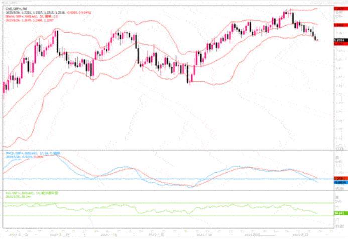 英国公债收益率在周四续涨,因投资者预计英国央行将进一步加息。本来较高的债券收益率通常会吸引资金流向固定收益投资,从而提振本币,但有分析师表示,投资者对英国的担忧占据主导地位。他认为,“进一步加息对仍处于压力之下的消费者来说不是好消息。而且对于经济增长的阻碍力道也会变大。英镑近期走势恐怕正反映了这种不稳定的状况。”此外,外部市场上美元的持续回强,也是导致英镑近期连连后撤的主要影响因素之一。日线图上,英镑/美元走出较为明显的下降通道,各类技术指标明显倾向下行。若1.23附近近两个多月以来的强支撑下破,镑美的下行幅度恐怕将要进一步拓深。