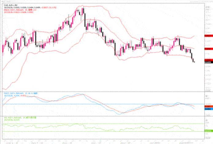 周四(5月25日)澳元兑美元继续遭受重挫低见0.6529,创下去年11月来新低。隔夜市场上,美国公布强于预期的经济数后,6月继续加息25个基点的预期概率大为提升,加之传出美国债务上限的谈判取得积极的进展,继续施压澳元。日线图上,澳元兑美元在跌穿关键横盘区间下沿支撑后,下跌幅度加大。这当中也可能是触发止损所致。在六月各主要央行尤其是美联储的利率会议前,预料澳元恐怕都要遭受下行的压力。日线图以及4小时图上,澳元/美元保持下行的斜率,近期应主防范澳元继续探低的风险。