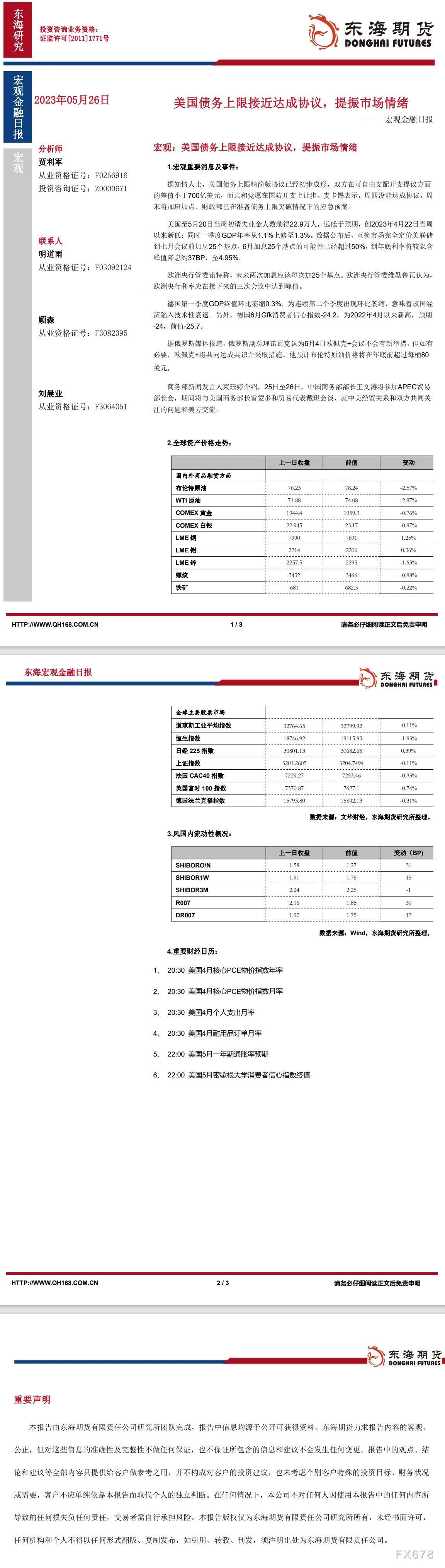 【东海期货5月26日宏观金融日报】:美国债务上限接近达成协议,提振市场情绪