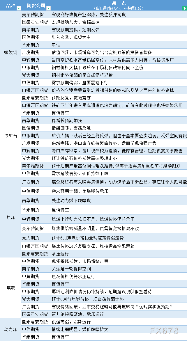 讯——期货公司观点汇总一张图:5月29日黑色系(螺纹钢、焦煤、焦炭、铁矿石、动力煤等)