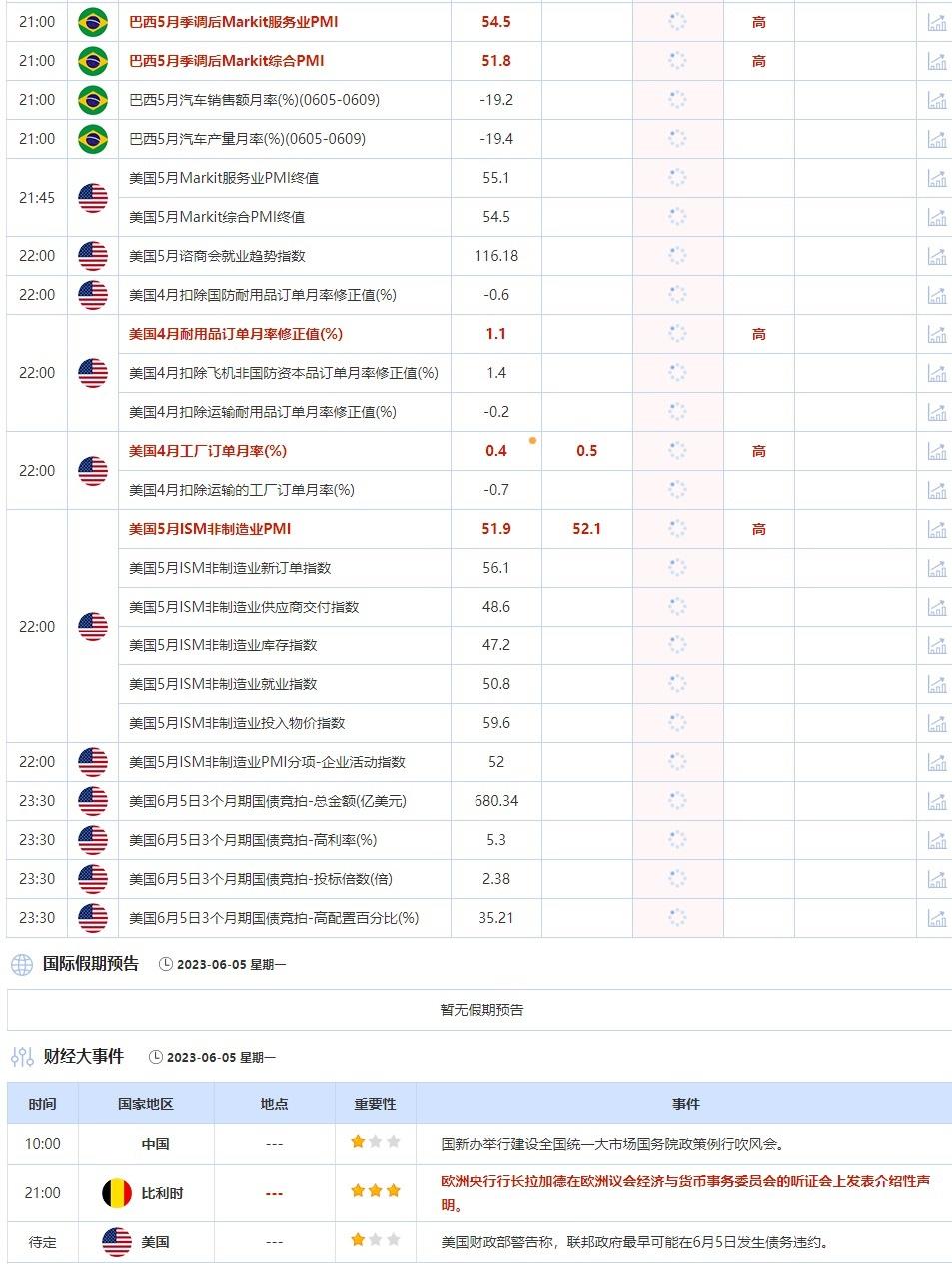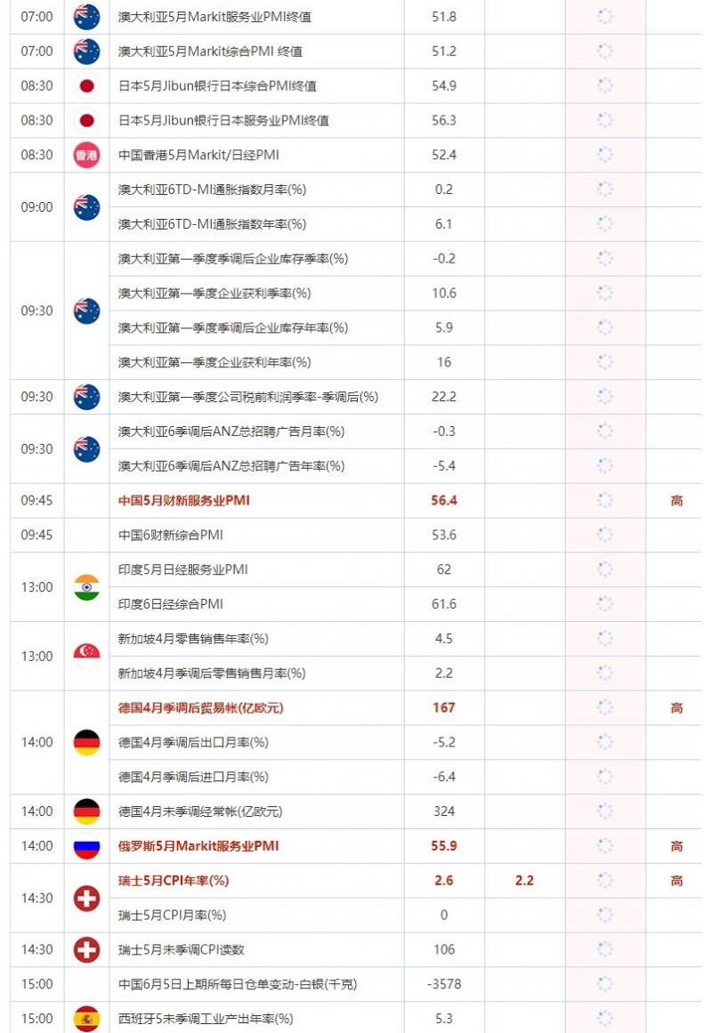 22:00 美国5月ISM非制造业PMI , 前值 51.9 , 预期值 52.1 , 公布值:待发布
