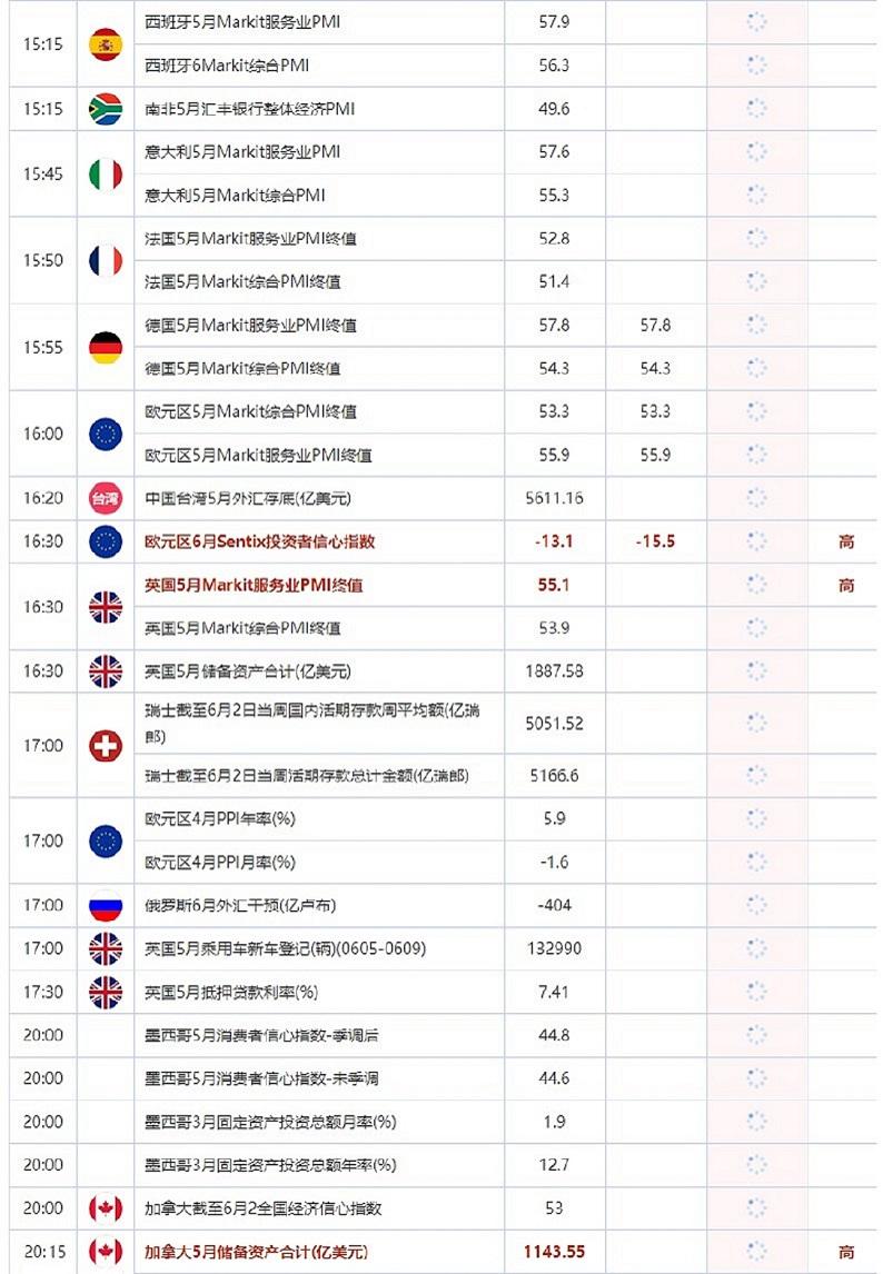 15:45 意大利5月Markit综合PMI , 前值 55.3 , 预期值 -- , 公布值:待发布