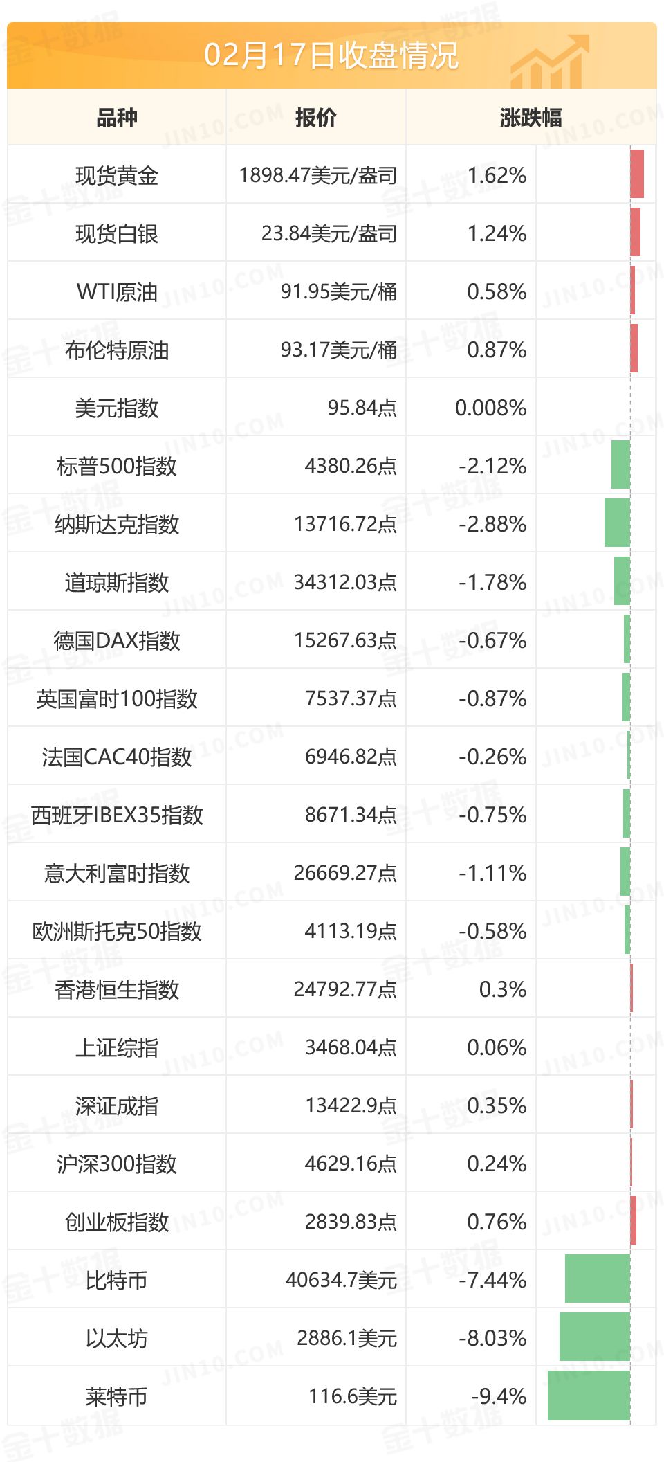 股市方面,美股三大股指全天走弱,道指收跌1.78%,报34312.03点;纳指低收2.88%,报13716.72点;标普500指数收跌2.12%,报4380.26点。明星科技股、银行股、中概教育股整体下挫,黄金股连续两日逆市上扬。