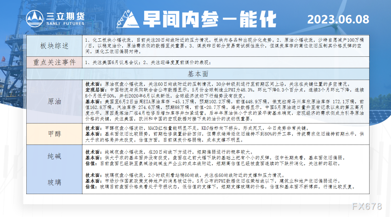 讯——三立期货早间内参显示,原油夜盘小幅收涨,关注60日均线附近的压制情况,30分钟级别运行至前期区间上沿,关注在关键位量的多空情况。甲醇夜盘小幅波动,MACD红柱量能明显不足,KDJ指标向下拐头,形成死叉,今日走势非常关键。