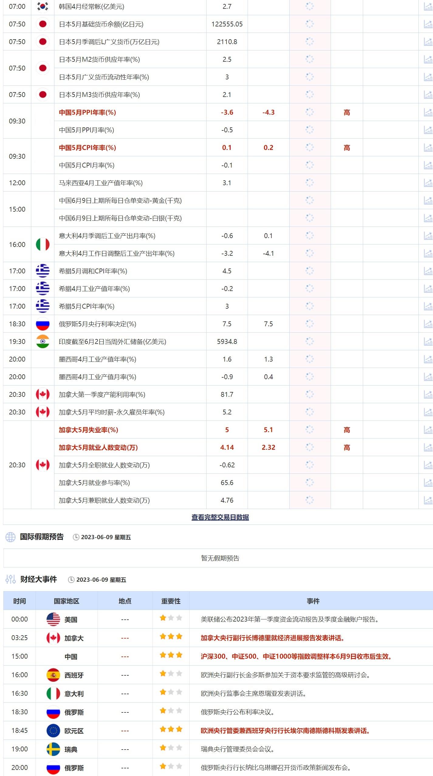 讯——6月9日,投资者需要关注的重点数据:中国5月PPI年率,中国5月CPI年率,加拿大5月失业率,加拿大5月就业人数变动。需要关注的大事件包括俄罗斯央行公布利率决议,欧洲央行管委兼西班牙央行行长埃尔南德斯德科斯发表讲话。