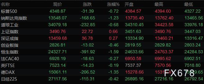美股收盘情况:标普500指数下跌0.7%,报4348.87点;道琼斯工业平均指数下跌0.7%,报34079.18点;纳斯达克综合指数下跌1.2%,报13548.07点;纳斯达克100指数下跌1.1%,报14009.54点;罗素2000指数下跌0.9%,报2009.333点。