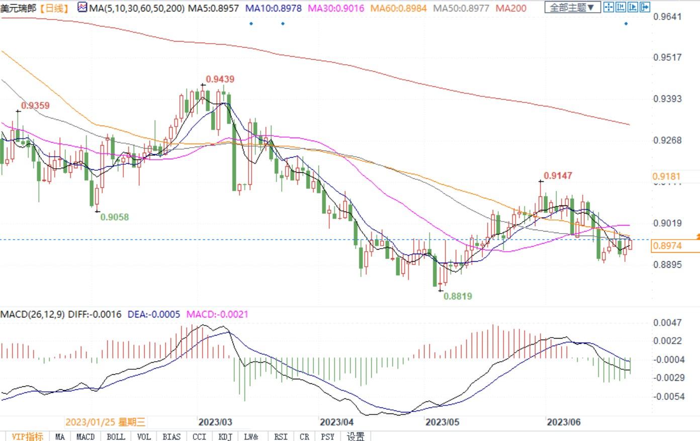 北京时间6月23日14:08,美元兑瑞郎报0.8974/75
