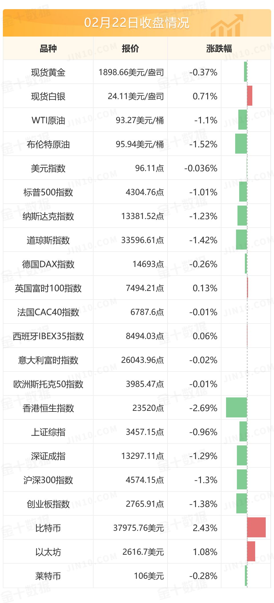 原油冲高回落,WTI原油收跌1.1%,报93.27美元/桶;布伦特原油一度站上99美元关口,但随后由涨转跌,收跌1.52%,报95.94美元/桶。