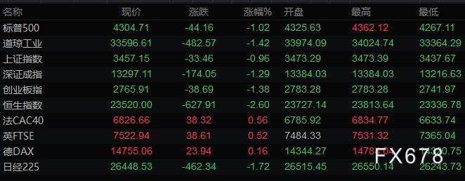 美股收盘情况:标普500指数下跌1%,报4304.76点;道琼斯工业平均指数下跌1.4%,报33596.61点;纳斯达克综合指数下跌1.2%,报13381.52点;纳斯达克100指数下跌1%,报13870.53点;罗素2000指数下跌1.5%,报1980.173点。