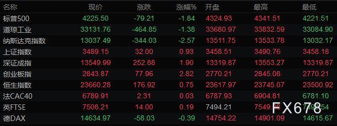 美股收盘情况:标普500指数下跌1.8%,报4225.5点;道琼斯工业平均指数下跌1.4%,报33131.76点;纳斯达克综合指数下跌2.6%,报13037.49点;纳斯达克100指数下跌2.6%,报13509.43点;罗素2000指数下跌1.8%,报1944.541点。