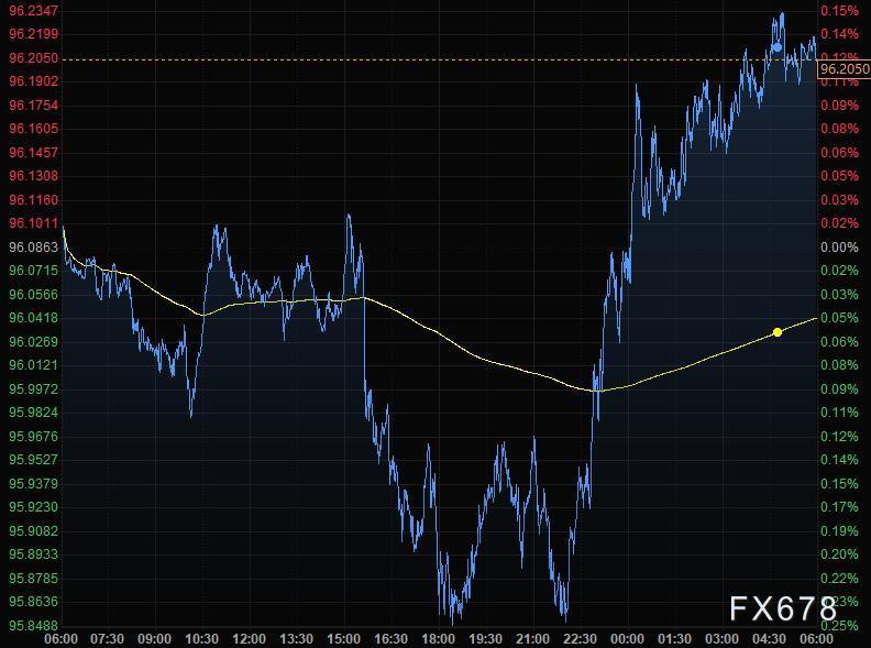 美元指数涨0.12%至96.20,此前一度下跌0.25%;美元稍早相对于其他货币普遍走低,之后转为涨跌互见。美国国债收益率全线攀升,10年期国债收益率上涨约2个基点至1.96%