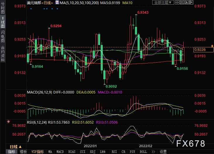 周四(2月24日)美元兑瑞郎在盘中看涨动能的推动下,欧洲中段跳升至一周高位,接近0.9250。