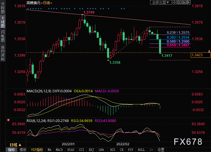 周四(2月24日)英镑兑美元欧洲时段延续跌势,跌至逾三周低点1.3420水平附近。