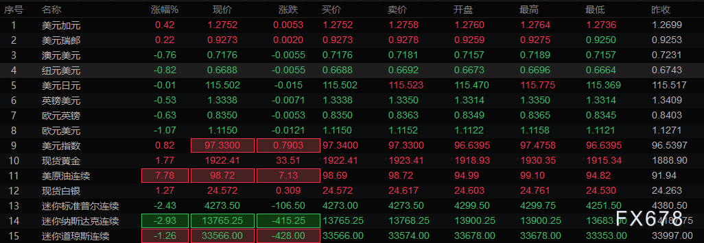 现货黄金周一(2月28日)盘初高开逾30美元,最高触及1930.35美元/盎司;美原油高开高走,一度涨逾8%,至99.10美元/桶;美元指数也大幅高开,最高触及97.47,目前交投于97.28附近;非美货币普遍走弱,欧元兑美元一度下跌1.33%,澳元兑美元和纽元兑美元均一度下跌逾1%;英镑兑美元一度下跌0.7%,目前交投于1.3343附近。