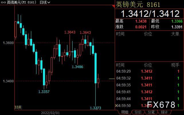 英镑兑美元收低1.36%至1.3412,创2021年12月22日以来新低至1.3273。俄罗斯与西方国家在乌克兰问题上对峙之际,投资者对英镑持谨慎态度。英国央行官员有关未来利率的评论也令英镑短线承压。