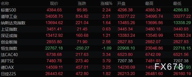 美股收盘情况:标普500指数上涨2.2%,报4384.65点;道琼斯工业平均指数上涨2.5%,报34058.75点;纳斯达克综合指数上涨1.6%,报13694.62点;纳斯达克100指数上涨1.5%,报14189.16点;罗素2000指数上涨2.3%,报2040.929点。