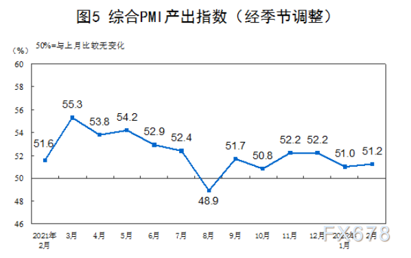2月份,综合PMI产出指数为51.2%,高于上月0.2个百分点,表明我国企业生产经营活动扩张步伐加快。构成综合PMI产出指数的制造业生产指数和非制造业商务活动指数分别为50.4%和51.6%。
