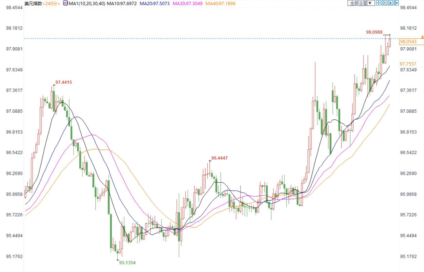 周六(3月4日)当周美元指数大幅攀升,当周美元指数势将上涨超2%。地缘局势引发的担忧情绪升温,美元作为避险品种受到青睐。投资者购入流动性更好的美元。鲍威尔本周发表谨慎的言论,做实了美联储本月中旬加息25基点的预期。