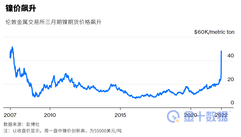 在任何市场上,一份合约在一天之内价值翻倍的情况并不常见。但周一,在伦敦金属交易所镍价收涨90%,盘中一度达55000美元/吨的高点,收于48078美元/吨。周二的行情更加疯狂,伦镍一度涨至100000美元/吨,几乎为上周五镍价的四倍。