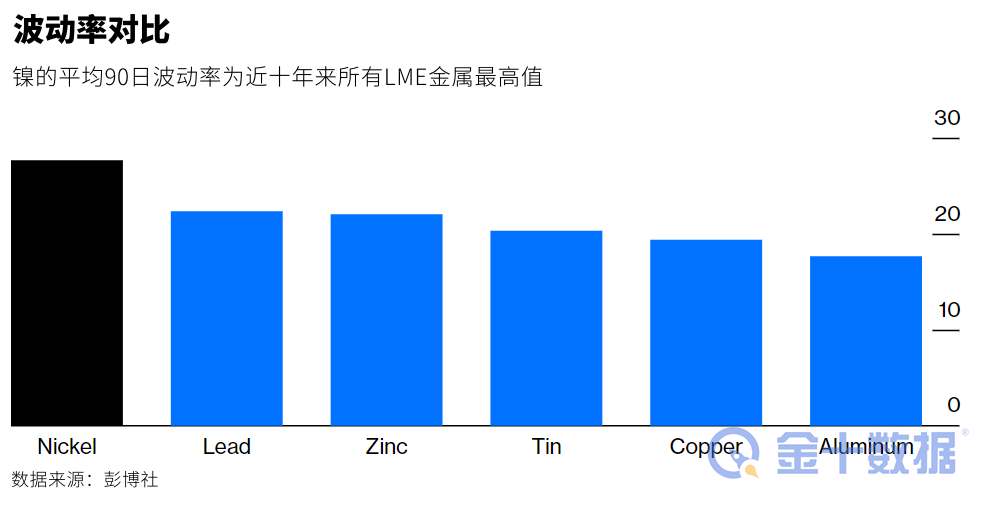 价格的剧烈波动是镍市场的常态,过去10年的镍平均90日波动率显著高于LME交易的其他金属。