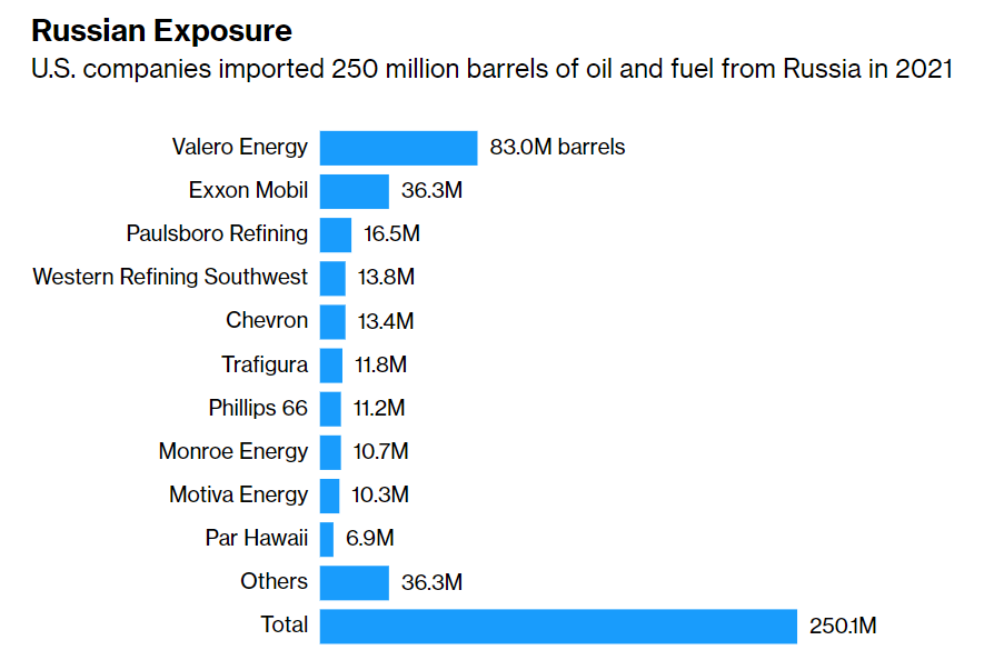 穆迪认为,美国对俄罗斯石油和精炼产品以及其他能源进口的禁令将主要影响美国炼油厂。