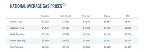 美国汽车协会(AAA)的数据显示,截至周三,美国当前全国汽油平均价格为每加仑4.252美元,高于昨天的4.171美元和一周前的3.656美元。