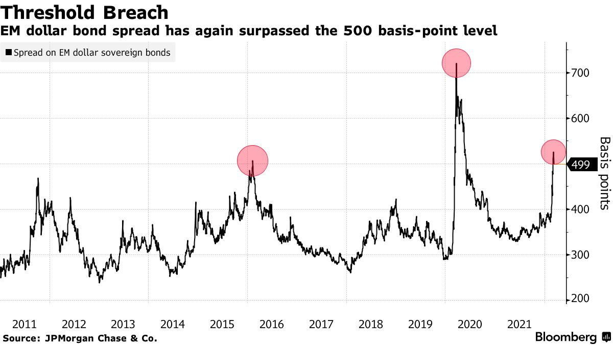 发展中国家主权债务对美国国债的额外收益率已超过500个基点,超过了10多年来仅两次突破的阈值。这吸引了包括FIMPartners和VontobelAssetManagement在内的基金经理押注利差将迅速下跌,就像他们在之前所做的那样。