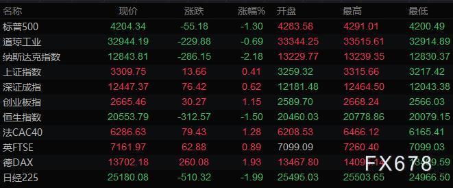 美股收盘情况:道琼斯指数收盘下跌229.88点,跌幅0.69%,报32944.19点;标普500指数收盘下跌55.18点,跌幅1.30%,报4204.34点;纳斯达克综合指数收跌286.15点,跌幅2.18%,报12843.81点。