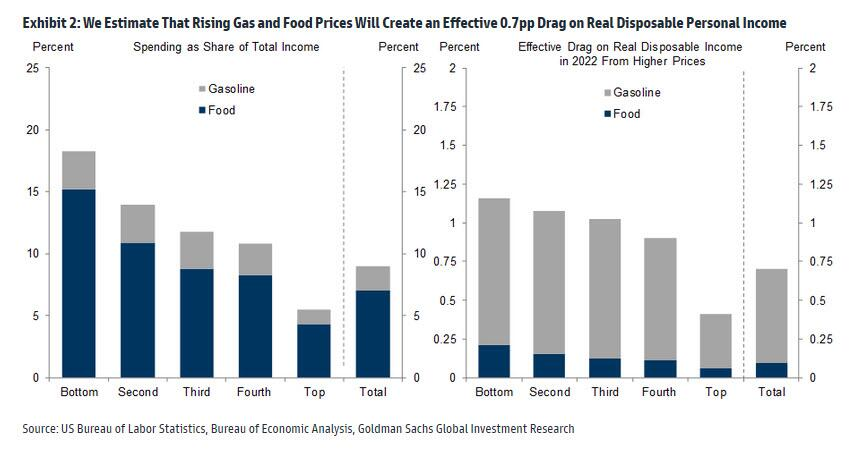 “自俄罗斯入侵乌克兰以来,石油等大宗商品的价格大幅上涨。我们的大宗商品策略师对近期原油和农产品的预测显示,实际可支配收入将因此减少0.7%,这将拖累2022年的支出。”