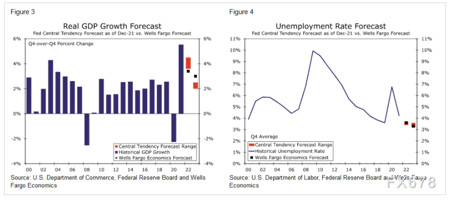 近期能源、农产品价格上涨带来的物价风险或推升通胀预期。 去年12月,联邦公开市场委员会对2022年核心个人消费支出物价指数PCE的预测中值为2.7%。富国银行预计,中值可能上修0.5-1.0个百分点,2023年上修0.1-0.2个百分点。就业方面,美联储对2022年末失业率的预测中值为3.5%。富国银行认为,美联储将小幅下修今年失业率预期至3.4%,恢复到疫情前水平。预计美国劳动力市场也将继续紧缩进而推高用工成本,今年的平均工资增长率将为5.0%,较此前预测的4.9%有所上升。