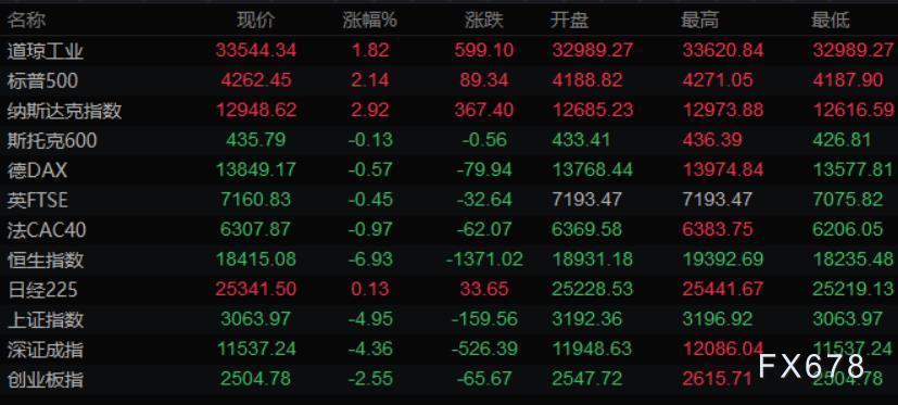 美股收盘情况:标普500指数上涨2.1%,报4262.45点;道琼斯工业平均指数上涨1.8%,报33544.34点;纳斯达克综合指数上涨2.9%,报12948.62点;纳斯达克100指数上涨3.2%,报13458.57点;罗素2000指数上涨1.4%,报1968.969点。