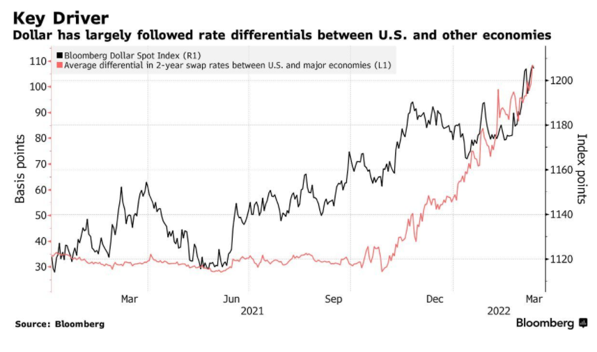 “如果美国带头采取超预期的强硬措施对抗仍未见顶的高通胀率,我们可能会看到外汇市场的交易员们跳转到‘利差’这一主题上。持有更高收益率货币的投资情绪也可能会主导外汇市场的中期趋势,并继续推动美元走高。”