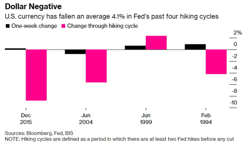 如下图所示,根据美联储和国际清算银行(BIS)自1994年以来的统计数据,在联邦公开市场委员会(FOMC)之前四个货币政策紧缩周期中,美元的平均贬值幅度约为4.1%,主要原因是投资者将加息视为购买增长型资产的理由之一。