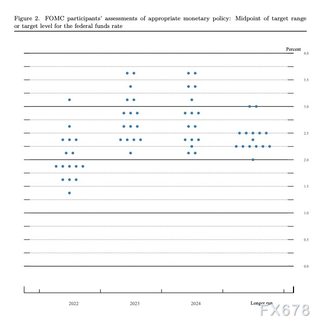 在美联储发布的点阵图中,官员们预测中值是基准利率到2022年末将在1.9%左右,与交易员的预期一致,但高于美联储先前的预期。他们对2023年末利率的预测中值为2.8%,这是他们给出的最后一个预测年份,由于乌克兰危机令全球经济承压,这次的预测可能比以往增添了更多不确定性。