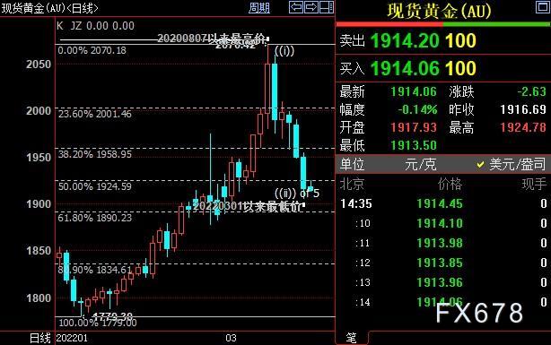 日线上看,金价自2070美元开启回调((ii))浪走势,触及((i))浪50%斐波那契回档位1925美元,后市或进一步下探((i))浪61.8%斐波那契回档位1890美元。((i))浪和((ii))浪是始于1779美元的上行5浪的子浪。