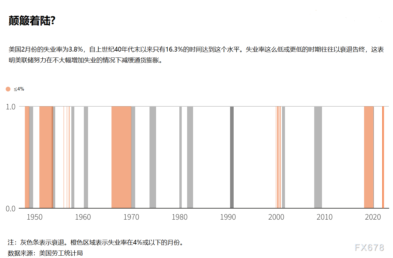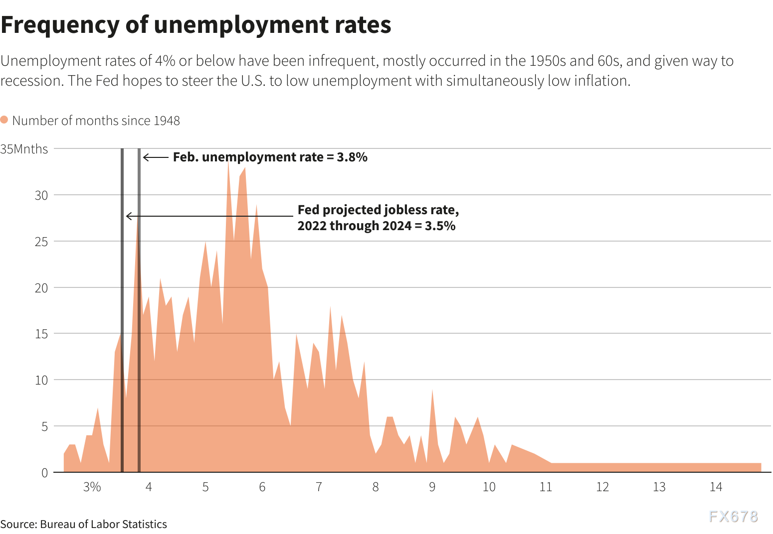 (图:自1948年以来各个水平的失业率数字出现的月份数;左边竖线:美联储预期2022-2024年失业率为3.5%; 右边竖线:2月失业率为3.8% )