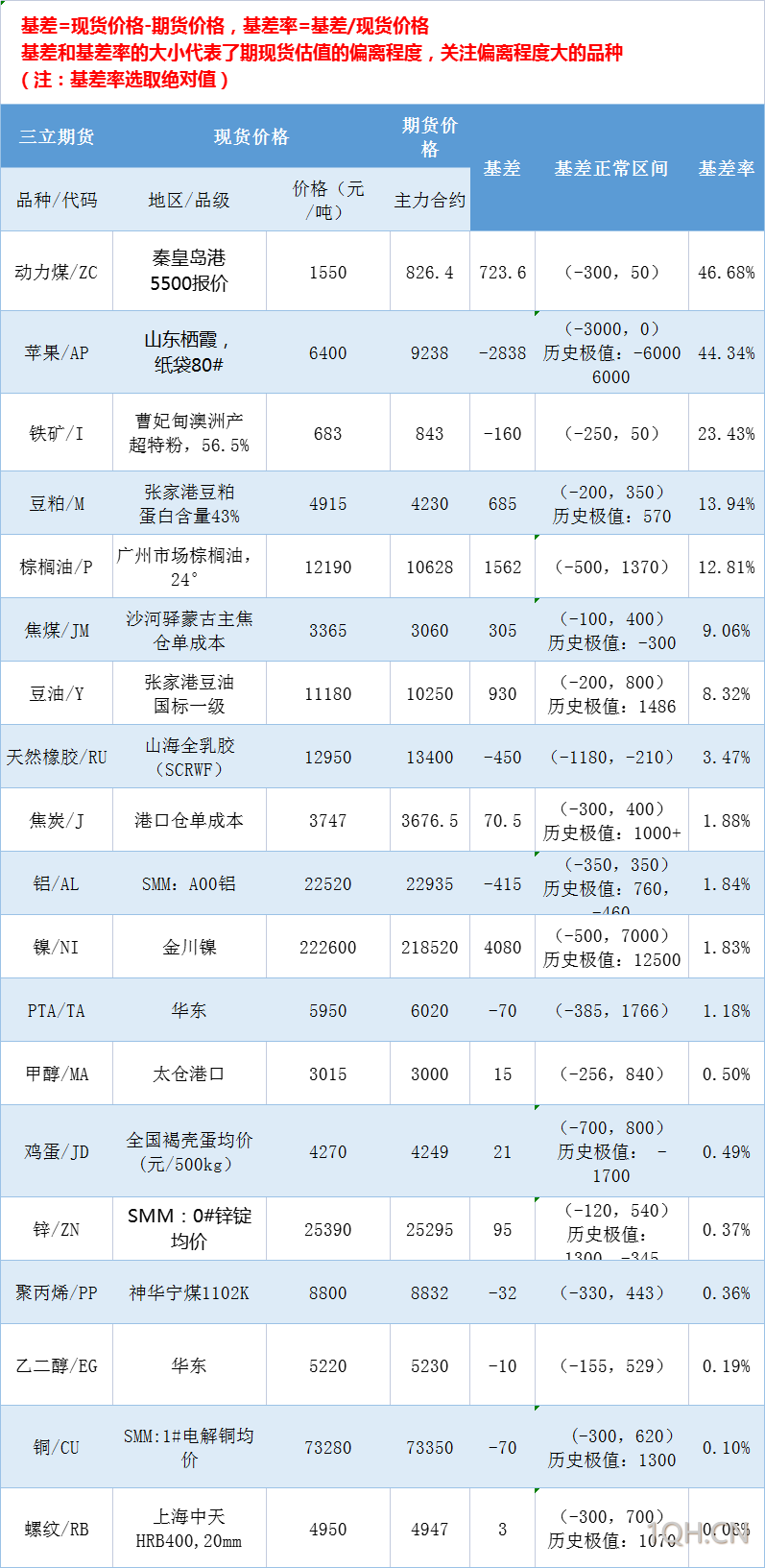 三立期货基差:一张图尽览3月21日有色金属、黑色系、能源化工和农产品基差(按基差率从大到小排序)