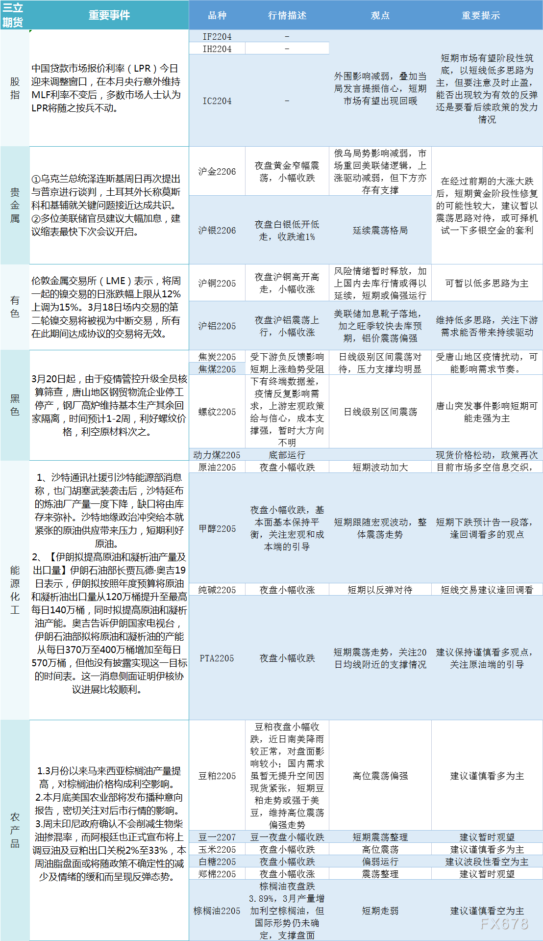 三立期货早评:一张图尽览3月21日股指、贵金属、能源化工、农产品、有色和黑色系预测。