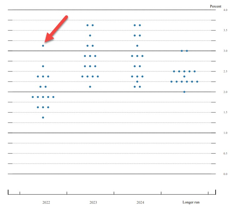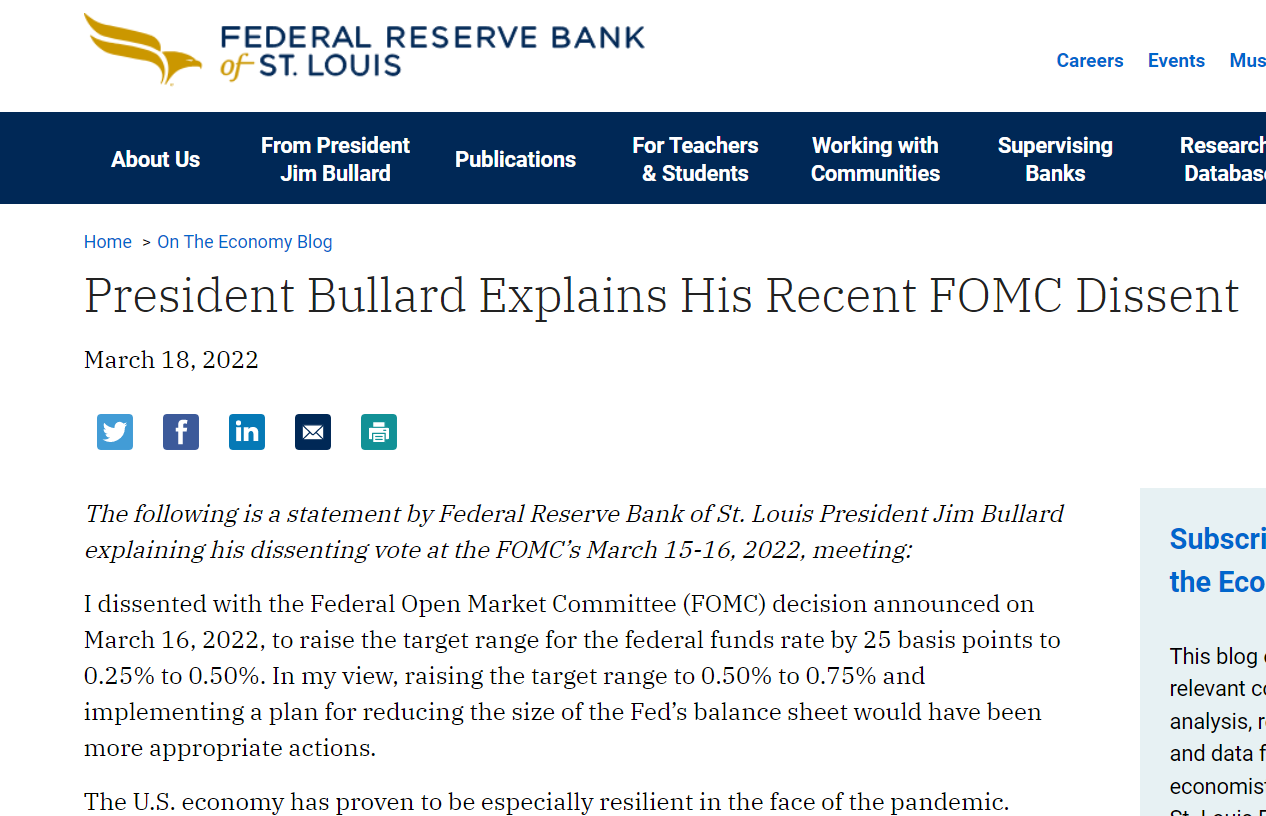 我反对联邦公开市场委员会(FOMC)于2022年3月16日宣布的将联邦基金利率目标区间上调25个基点至0.25%至0.50%的决定。在我看来,将目标区间上调至0.50%至0.75%并实施缩减美联储资产负债表规模的计划将是更合适的行动。