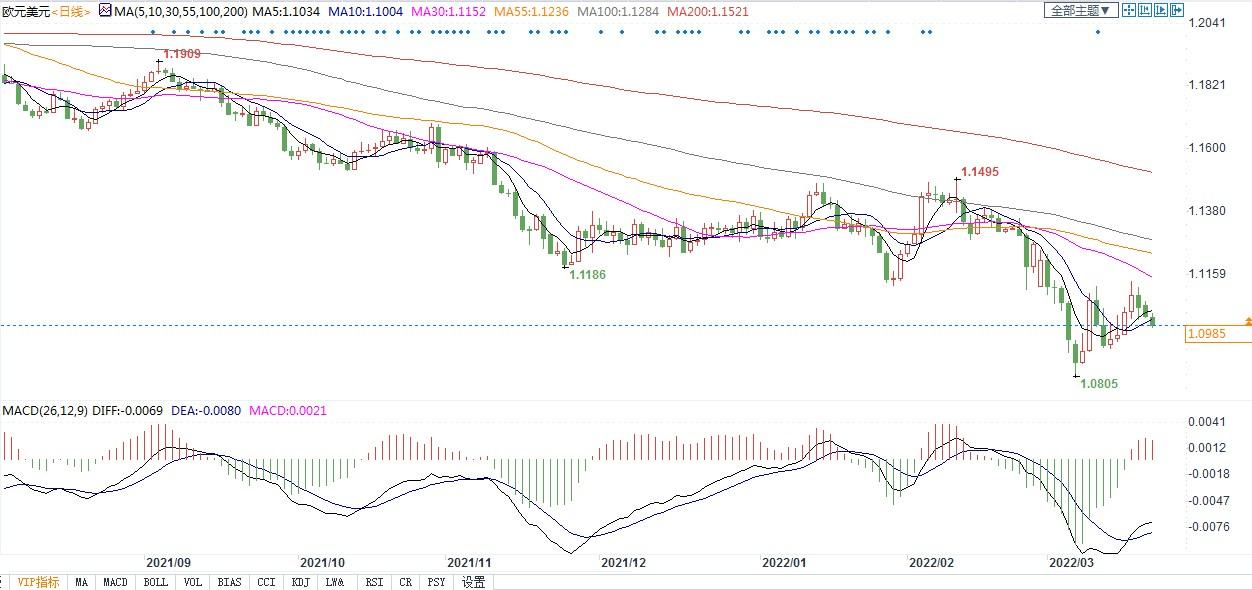 北京时间3月22日14:27,欧元兑美元报1.0984/85。