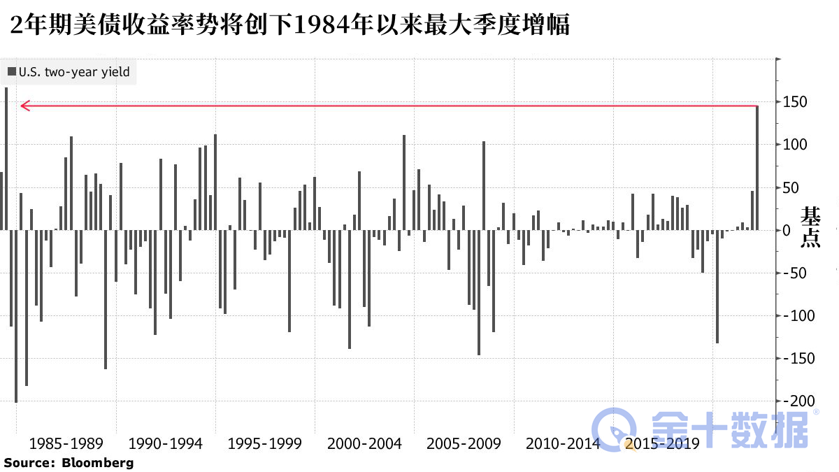 周二10年期美债收益率领涨,一度攀升近10个基点。与政策预期密切相关的2年期国债收益率一度上涨约7个百分点至2.18%,使其自2021年以来的涨幅扩大至145个基点,有望实现自1984年以来最大的季度增幅,当年美联储以50个基点或更大的幅度逐步收紧政策。