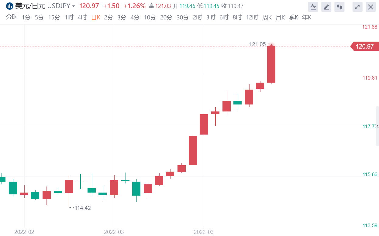 在美联储主席鲍威尔暗示可能在5月加息50个基点后,东京汇市周二下午,日元兑美元汇率持续跌至六年新低,美元兑日元向上触及121,日内涨1.28%。