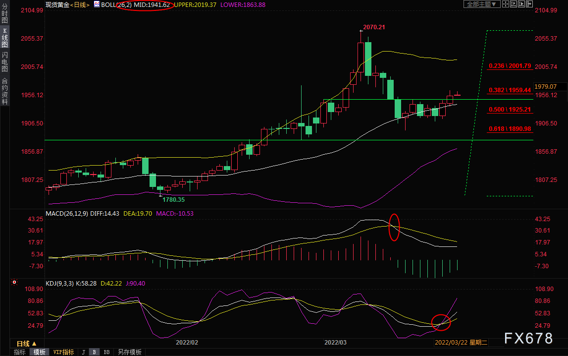 关注布林线中轨1941.64附近支撑,由于MACD死叉信号仍在,若回落至该位置下方,则削弱短线看涨信号。