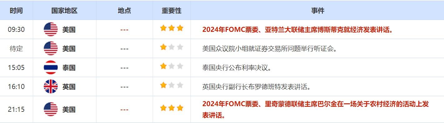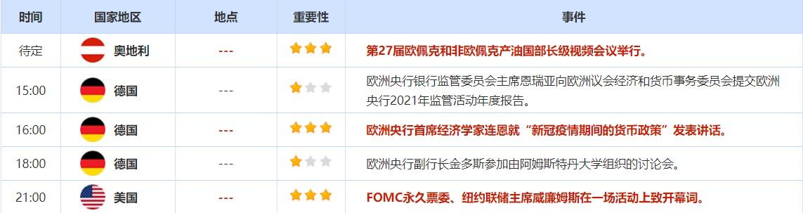 今年年初,费城联储主席哈克在接受采访时表示,如果美国通胀率继续飙升,他将支持在今年加息超过三次。投资者需关注其周二的讲话,观察其对加息的观点是否改变,