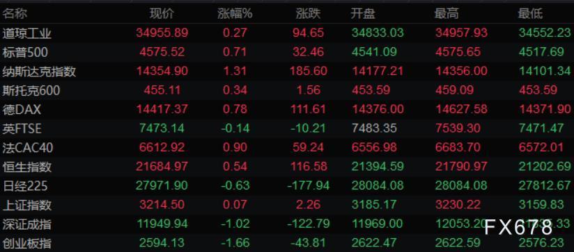 美股收盘情况:标普500指数上涨0.7%,报4575.52点;道琼斯工业平均指数上涨0.3%,报34955.89点;纳斯达克综合指数上涨1.3%,报14354.9点;纳斯达克100指数上涨1.6%,报14987.4点;罗素2000指数基本持平,报2078.06点。
