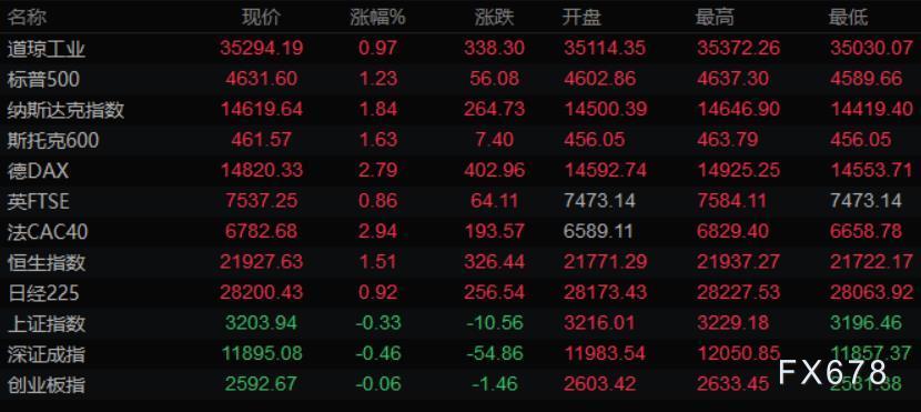 美股收盘情况:标普500指数上涨1.2%,报4631.60点;道琼斯工业平均指数上涨1.0%,报35294.19点;纳斯达克综合指数上涨1.8%,纳斯达克100指数上涨1.7%,罗素2000小盘股指数上涨2.6%。