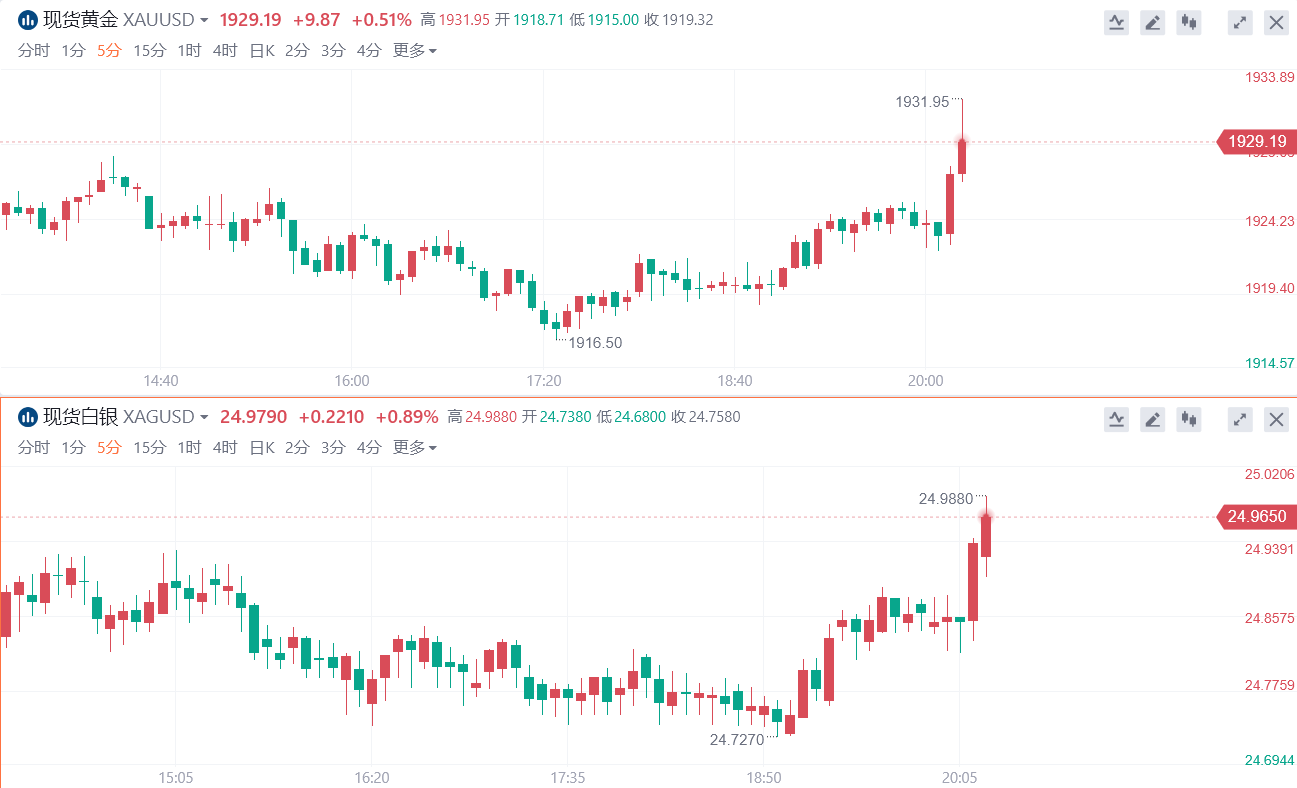 在新消息的影响下,现货黄金拉升5美元,一度站上1930美元/盎司,现货白银逼近25美元关口。