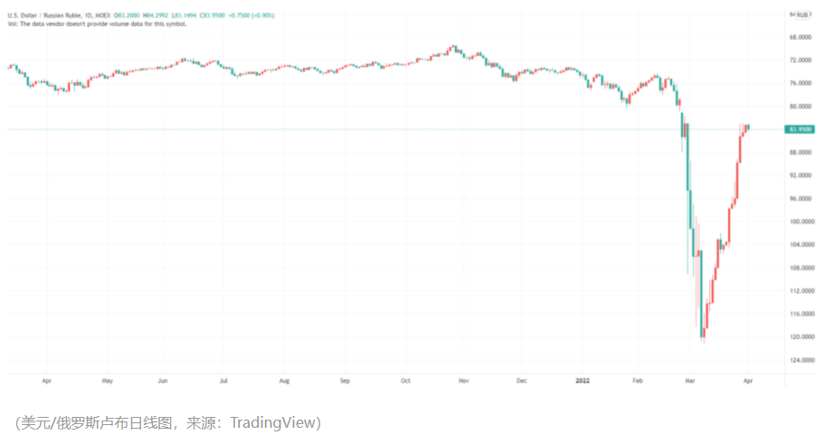但有一个不争的事实是,虽然西方国家仍在加码相关制裁,但随着俄央行将本币与黄金和能源绑定,俄罗斯卢布的汇率已经接近全面收复失地,顺手还推动了一把全球能源结算机制的历史进程。截至上周五收盘,美元兑俄罗斯卢布报83.95,此前卢布最低时曾跌到121.21。