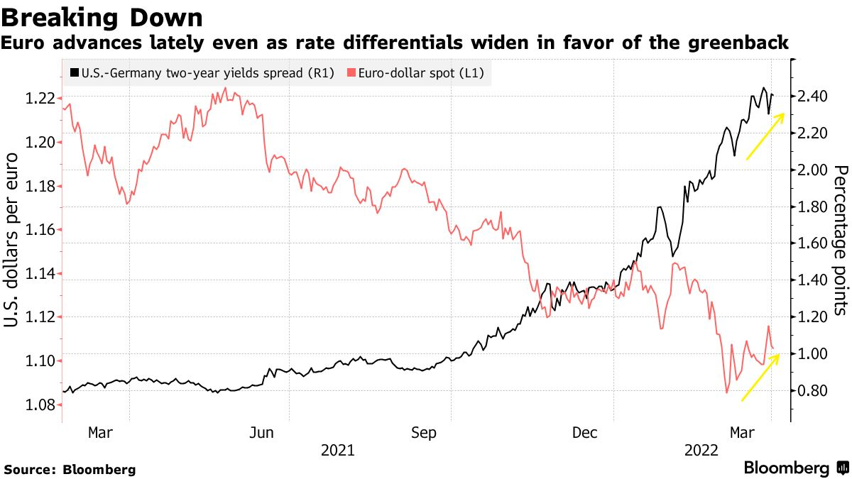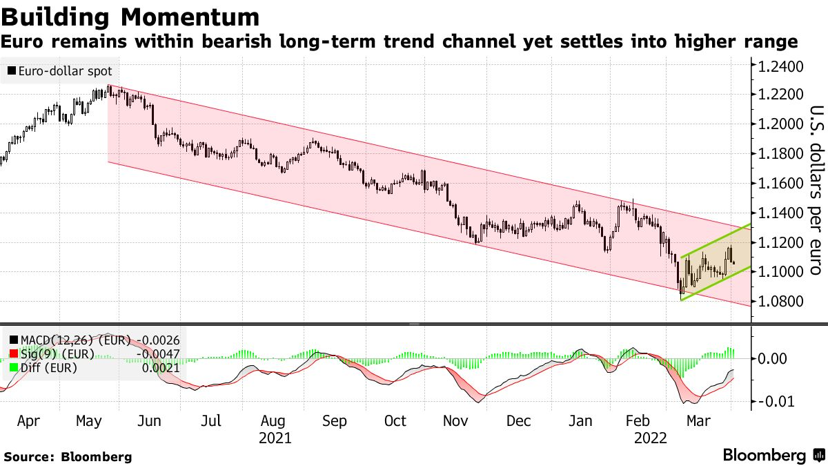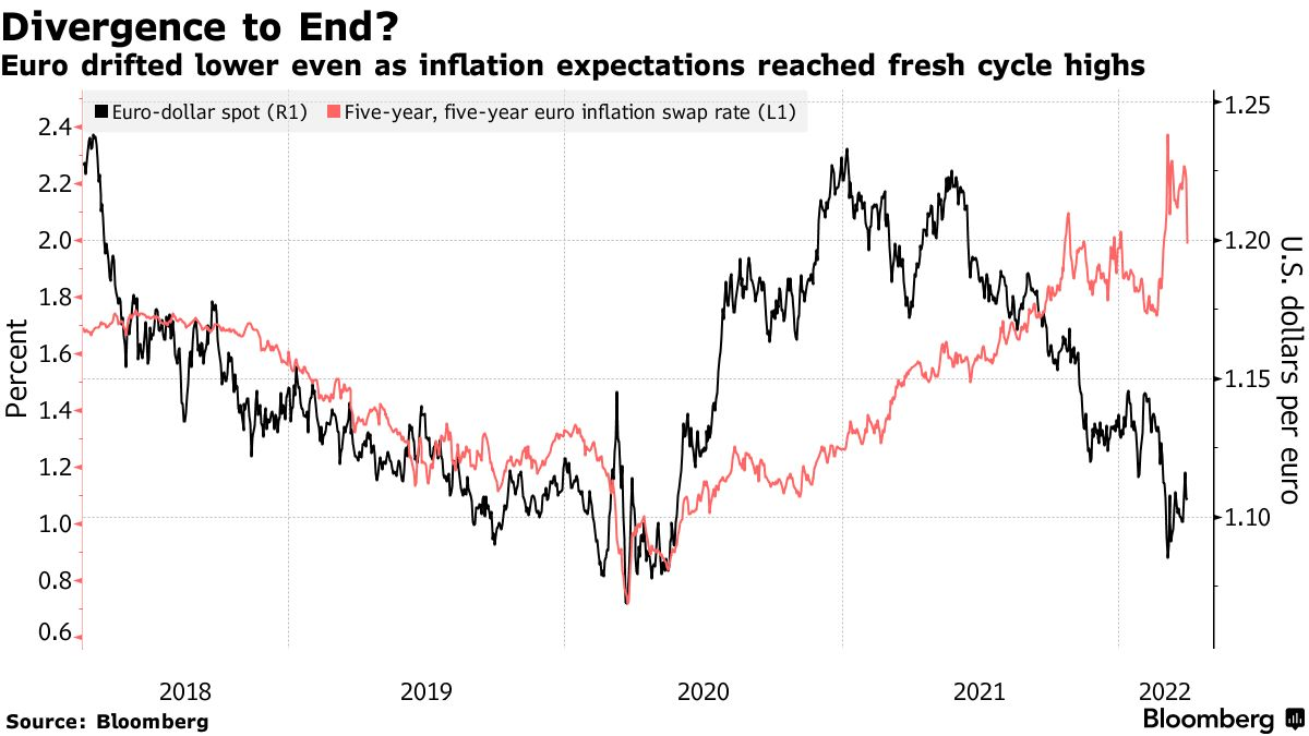 就在上个月,分析人士还在猜测欧元将跌至与美元平价,因为欧洲地理位置接近战争,而且依赖俄罗斯的能源。现在,在政策制定者一再重申可能在今年加息以抑制创纪录的高通胀的鼓动下,一些交易员正准备迎接进一步的上涨。